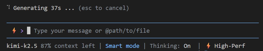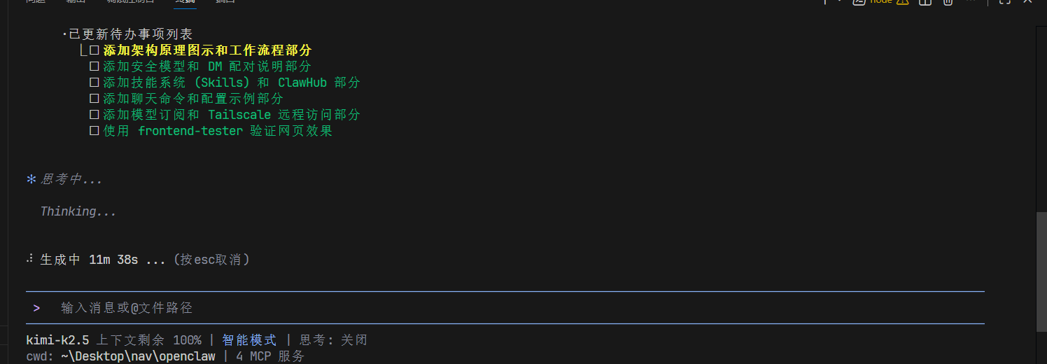 反馈一个问题:在使用 kimi-k2.5 模型时,经常会陷入长时间的 “Thinking…” 状态。即使是非常简单的任务,生成时间也会持续很久(实测已经达到 24 分钟以上),但任务始终卡在思考阶段无法完成,也没有结果输出。