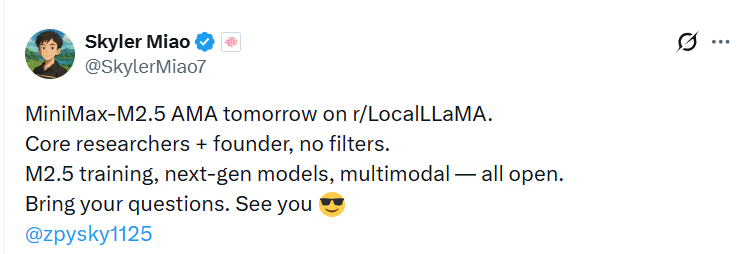 刚从 X (原 Twitter) 刷到重磅消息:MiniMax 官方核心团队(核心研究员 + 创始人)即将在 Reddit 的 r/LocalLLaMA 版块开启 AMA (Ask Me Anything) 活动!