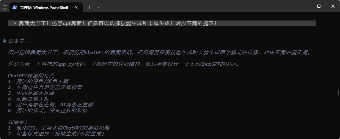 就比如例子中,大模型思考中列出的内容,其实就是仿照ChatGPT这几个字而“优化,总结”出来的需求点。虽然最终实现出来的效果依然很差,这可能和前面大佬所说的模型训练数据集覆盖有关,也可能和模型本身有关,但至少提供了相比感性化词语更标准的需求内容,而且这个过程前置的话,可以让用户有计划在这个的基础上再进行补充和修订,而不是ai拿到就开整,也是给不是特别熟悉技术术语,不是特别擅长提示词工程的普通用户,提供了一些范例和思路方向,再不济,还可以再回退回之前的输入。