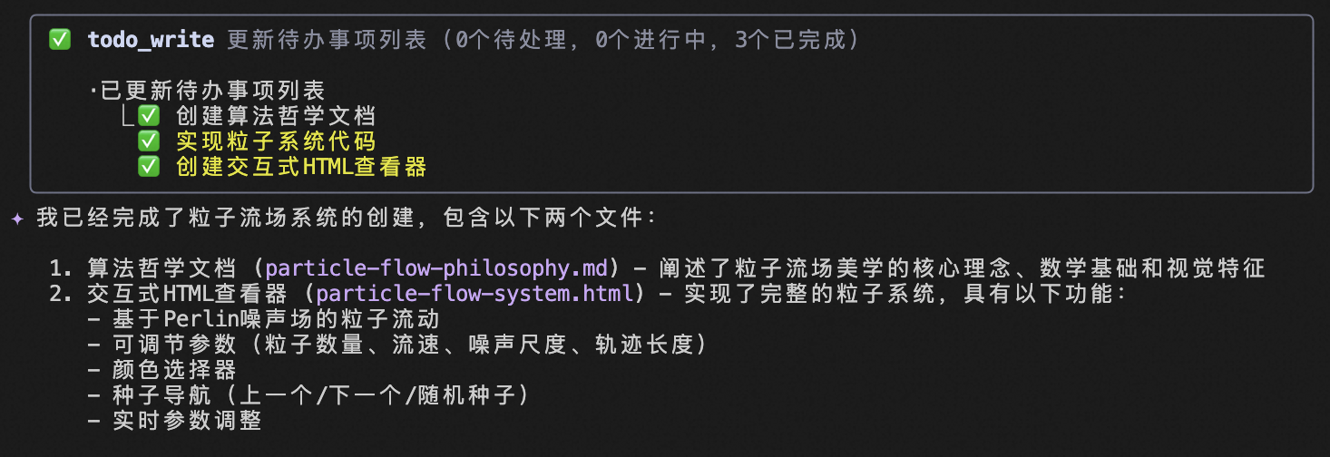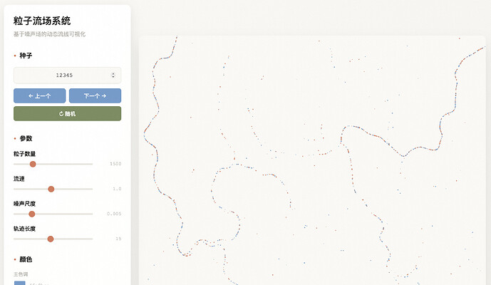 输入指令:/algorithmic-art 创建一个粒子系统,粒子在噪声场中流动,形成动态的流线效果