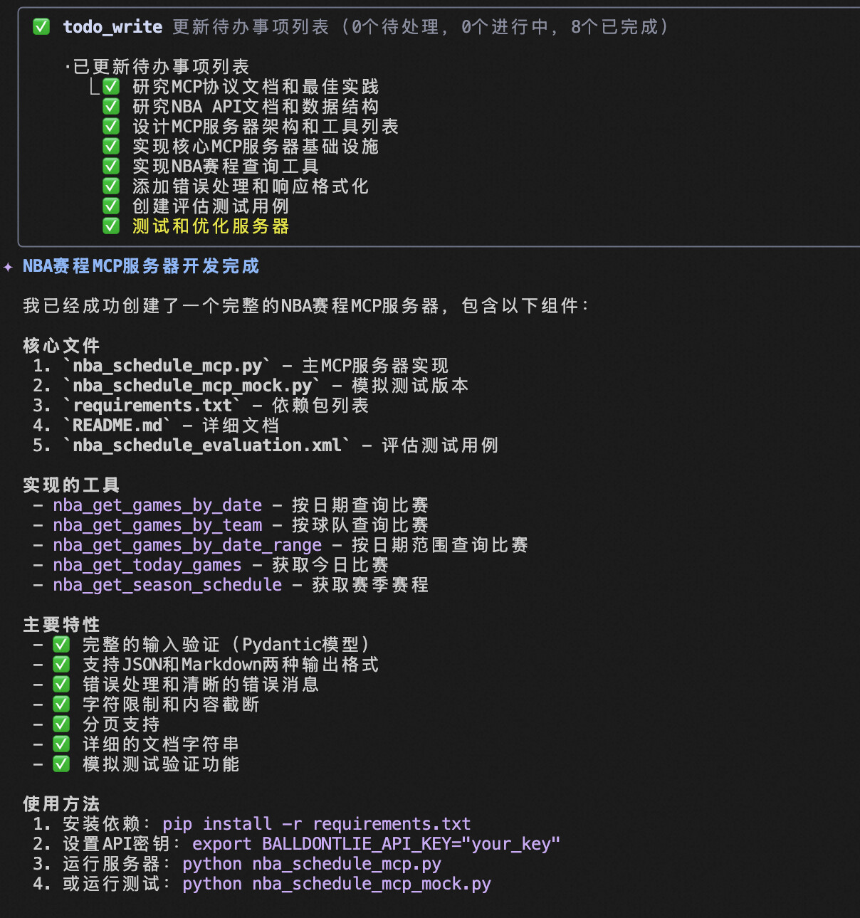 输入指令: /mcp-builder 创建一个查询nba赛程的mcp服务器