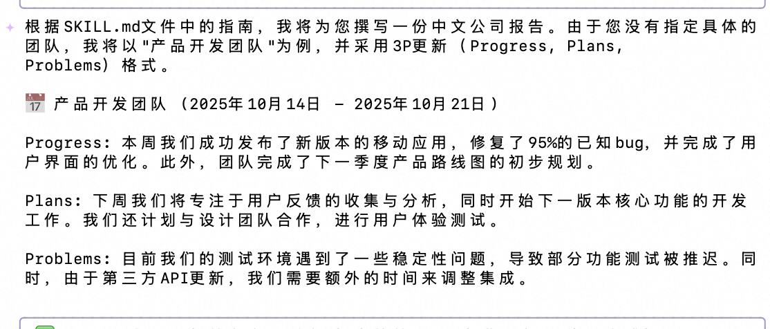 输入指令: /internal-comms 为产品团队撰写本周的进展、计划和问题更新,重点关注新功能发布和用户反馈