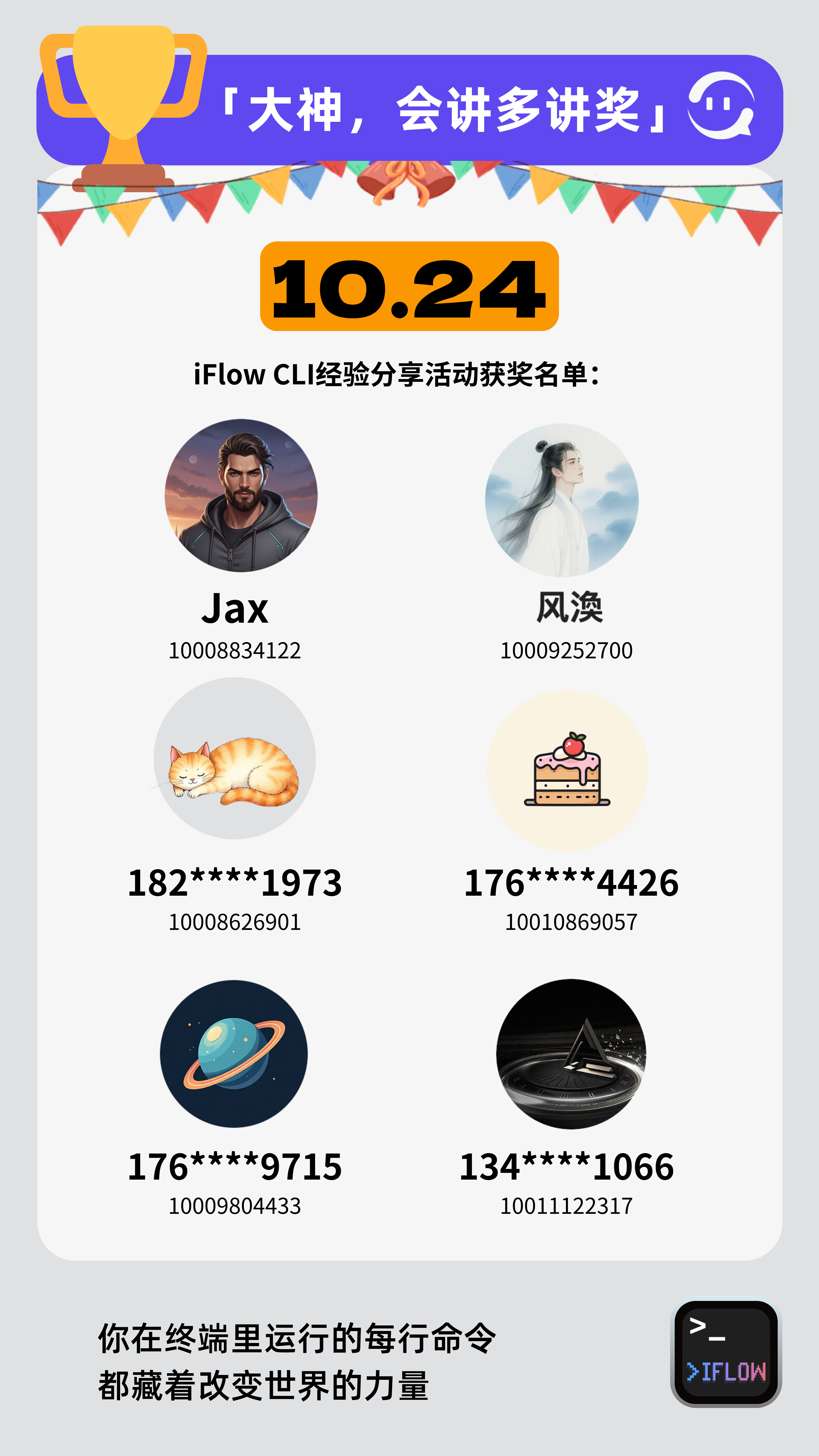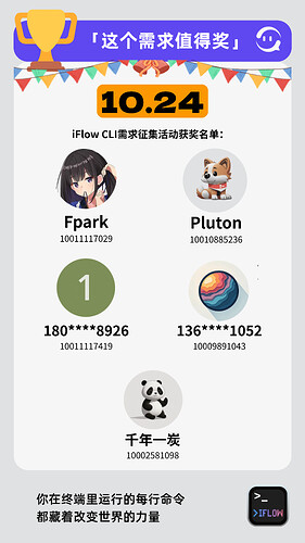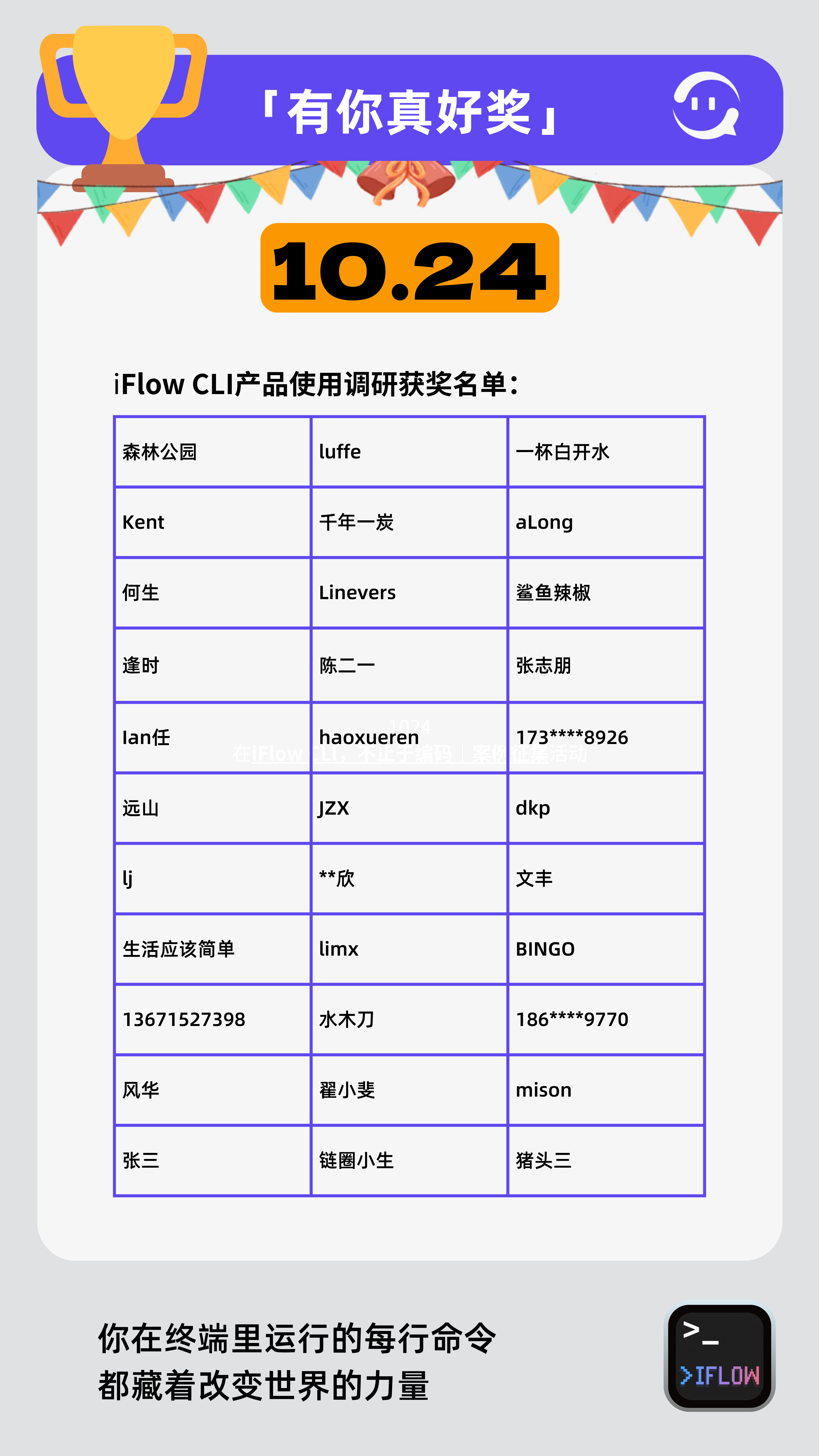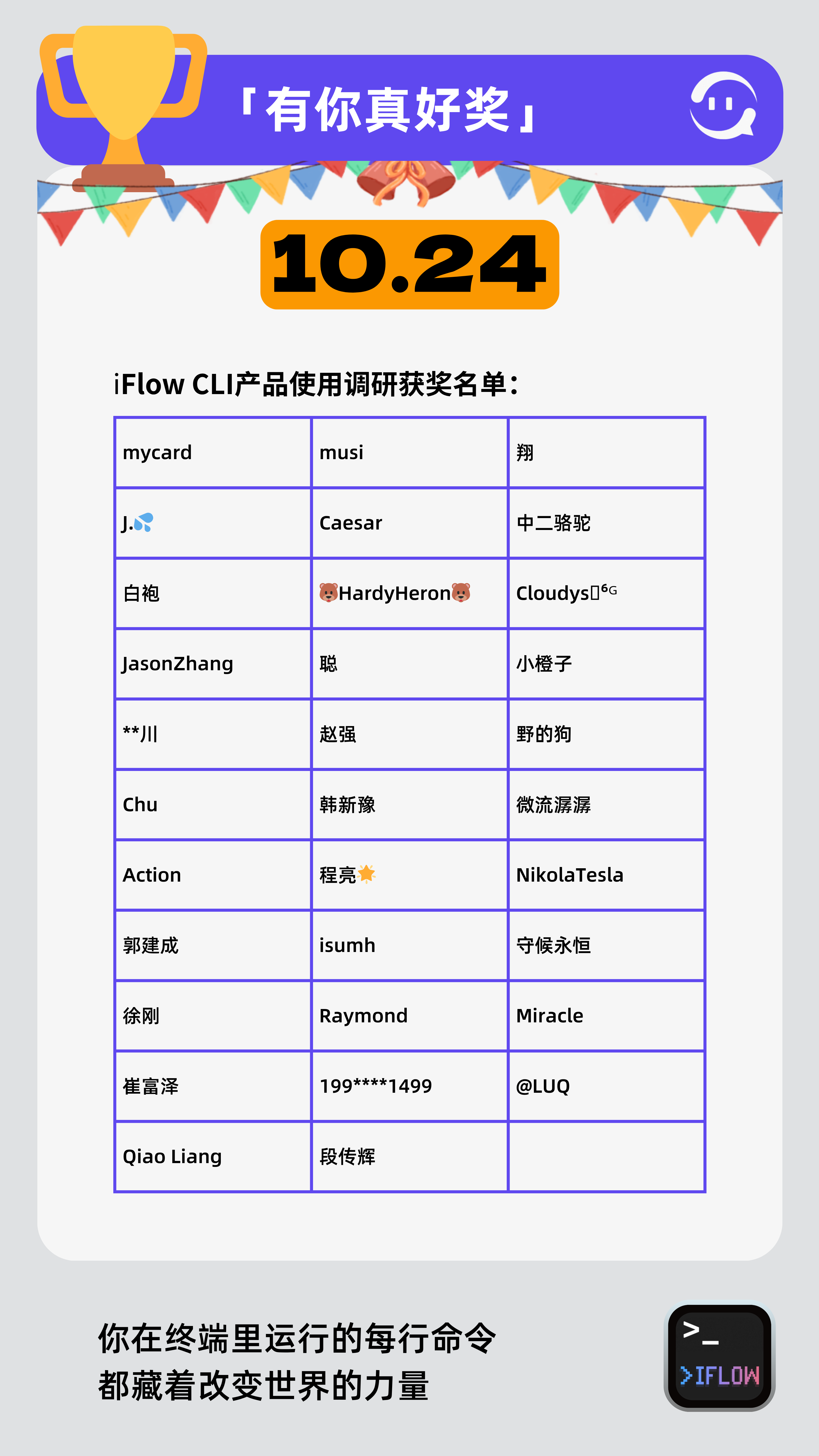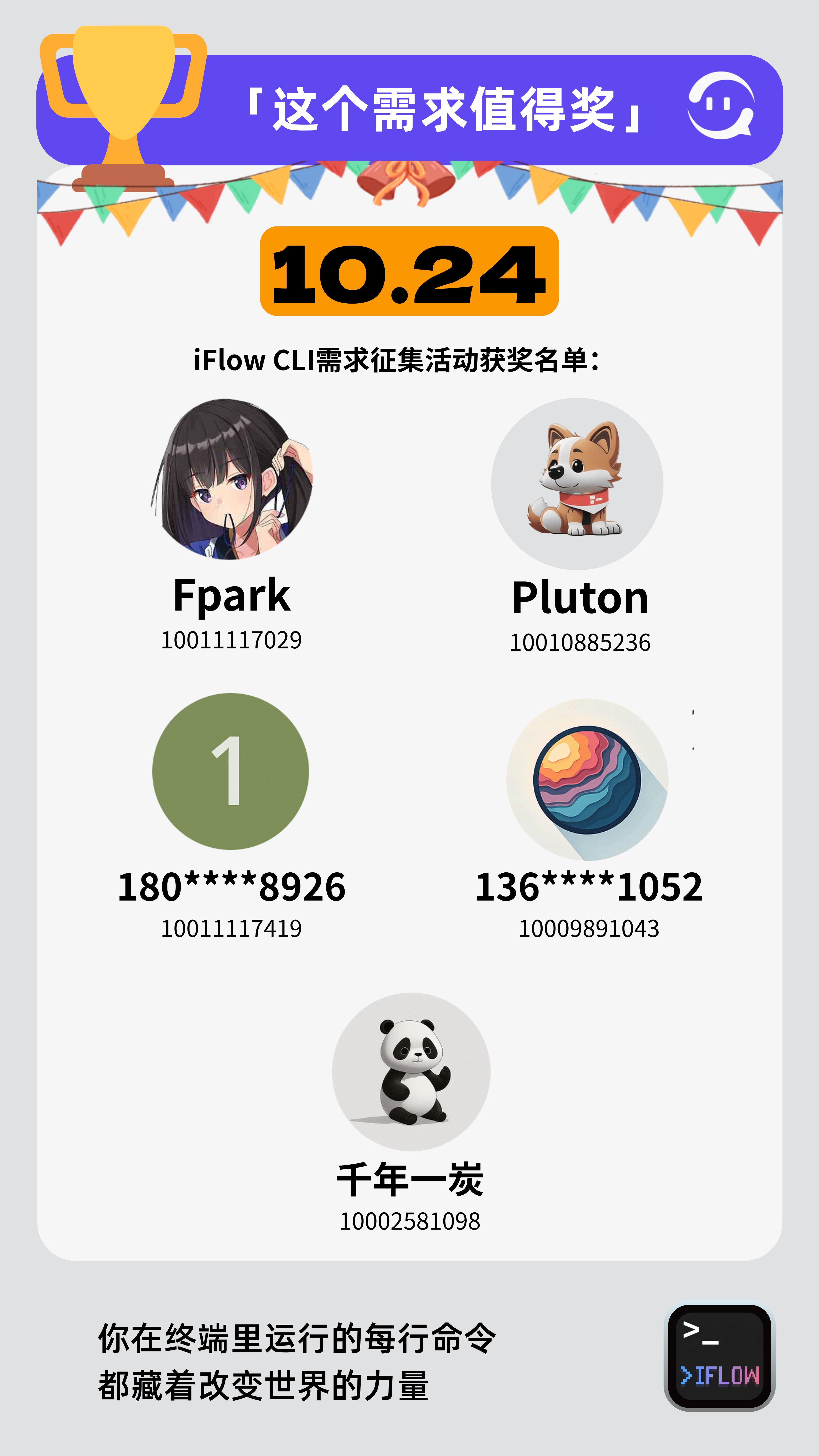 PS:iFlow CLI 有奖调研将持续至 10 月 30 日,每日继续揪 10 位用户赠送礼物哦~