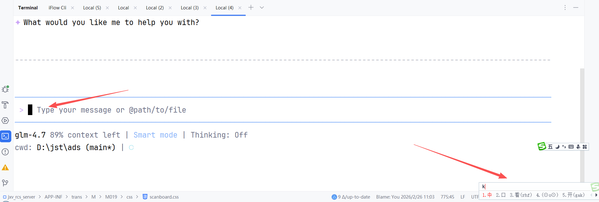 IDEA集成的windows终端中使用iflow,中文提示词不能随着光标处出现,始终固定在右下角。这样打字非常不方便