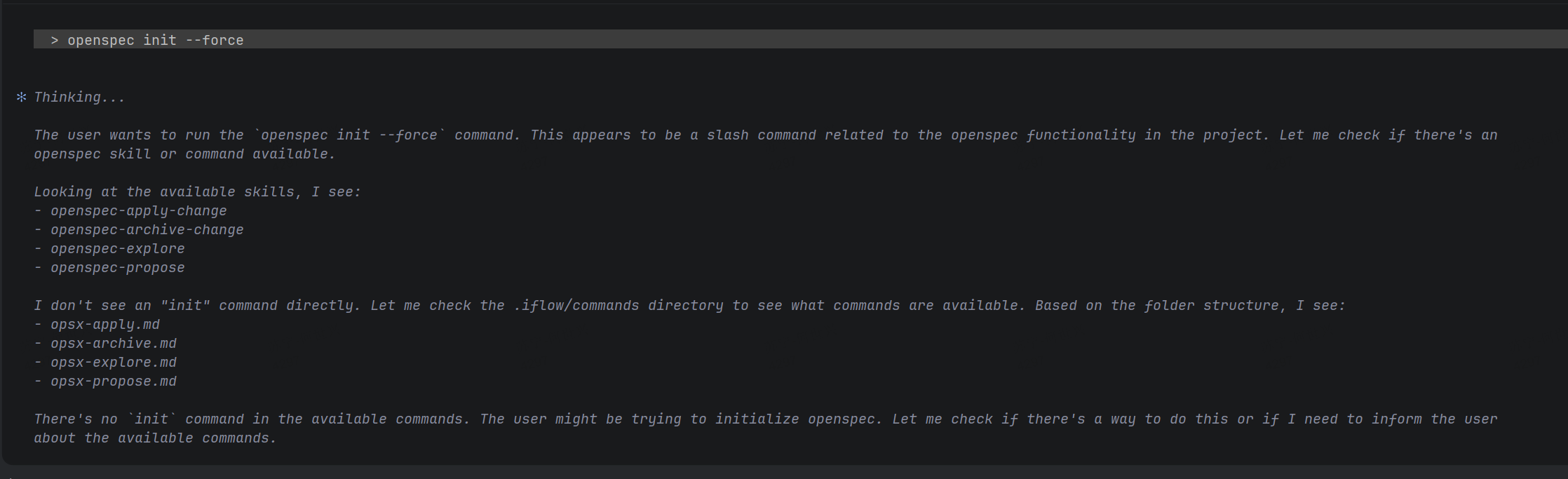 虽然不知道为什么没有结果,但是这个命令不是在 iflow cli 里执行的,是在命令行执行的,用来初始化项目的,还有就是 openspec 没有适配 iflow,想要用来初始化 iflow 的项目需要使用下面的方式,同样的也是需要在命令行执行,执行后再启动 iflow cli