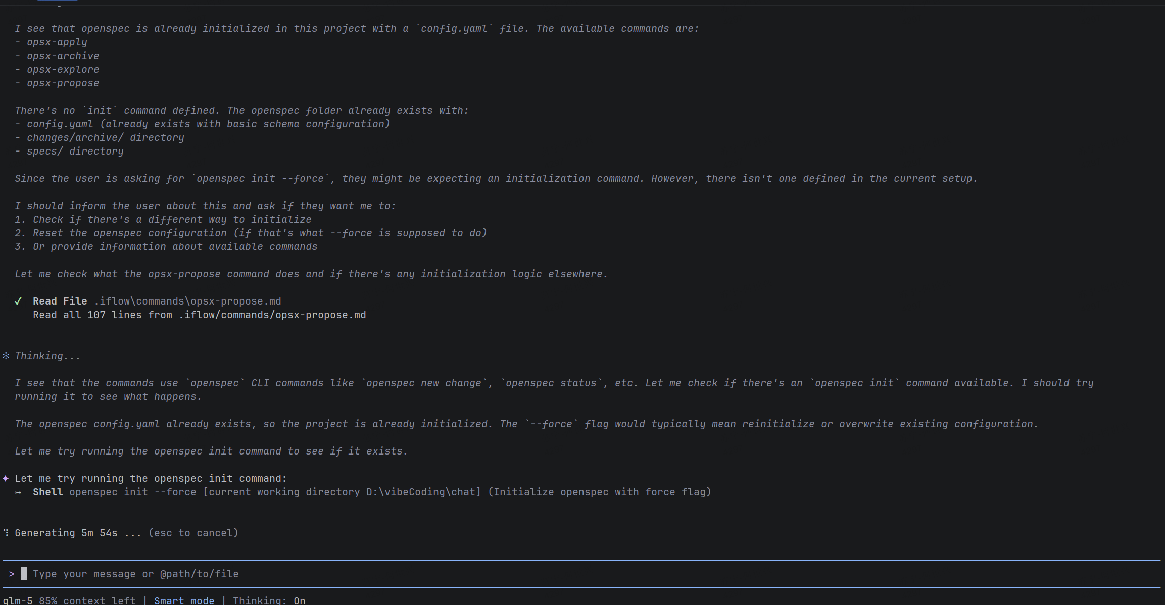 在iflow使用open-spec,一直加载,加载了两小时还是没结果,有人知道是什么问题吗?