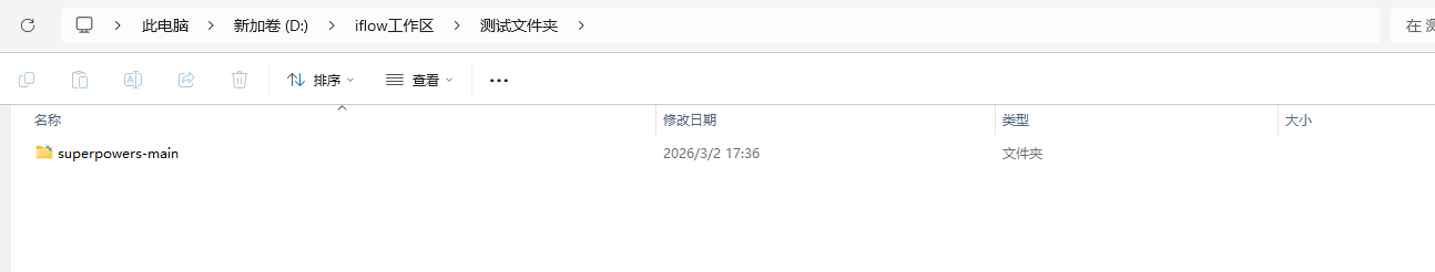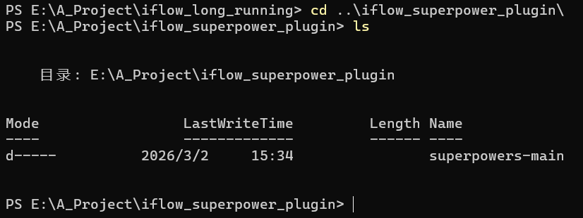 如图,在 powershell 的当前文件夹下安装 ‘iflow workflow add “superpowers-wfurrA” ’后,进入 iflow 后不起作用,没有 /superpowers 相关命令