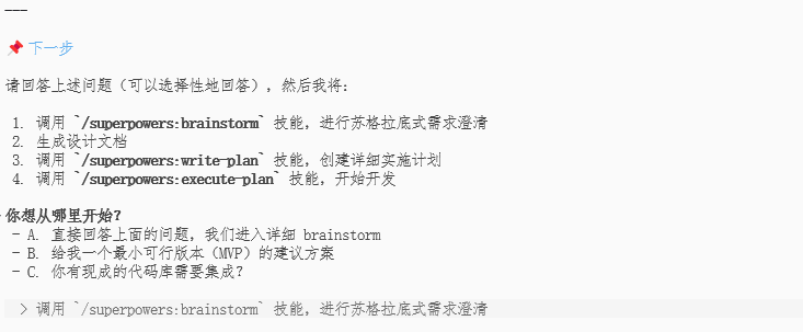 /superpowers:brainstorm 技能,进行苏格拉底式需求澄清在全局AGETNS.md里面加个规则, 默认使用超能力.