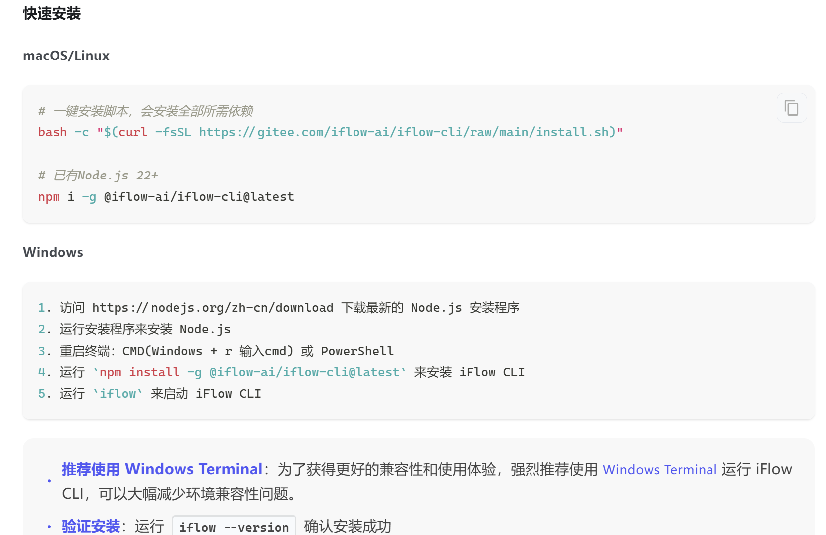 # 一键安装脚本,会安装全部所需依赖bash -c "$(curl -fsSL https://gitee.com/iflow-ai/iflow-cli/raw/main/install.sh)"# 已有Node.js 22+npm i -g @iflow-ai/iflow-cli@latest