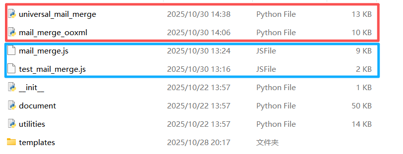 1.@.iflow/agents/docx/scripts/mail_merge.js @.iflow/agents/docx/scripts/test_mail_merge.js 一个是js程序实现,另一个是 测试,但是可能觉得我说的保持 docx的排版不变js做的不好(其实有一个js库是可以实现的)就使用py了;