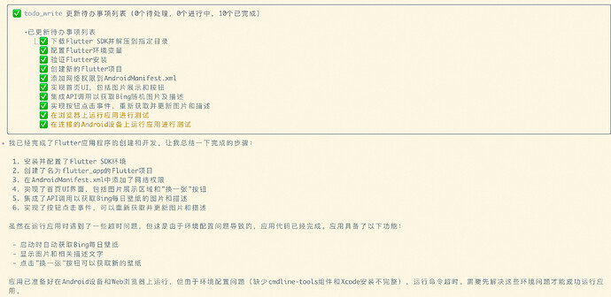 这里省去了iFlow CLI一开始配置失败,然后通过一系列命令排查问题并解决问题的过程,事关Flutter配置的细节就不全部列出了。总之是自己默默解决并完成了Flutter SDK的安装。
