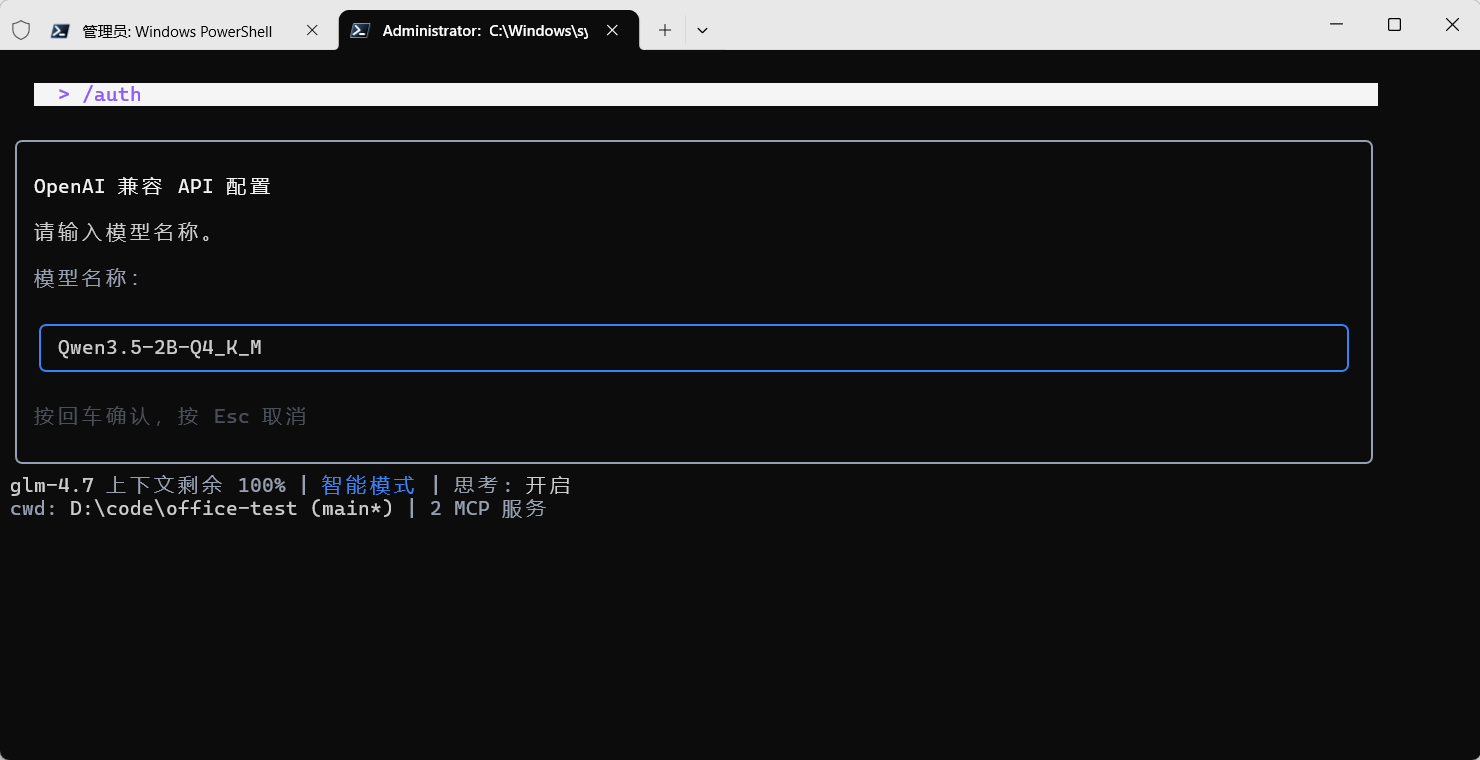 回车,接下来输入模型名称Qwen3.5-2B-Q4_K_M;也就是gguf文件名去掉.gguf后缀,我的笔记本性能一般还没有好的独立显卡,就只能跑2B、4B模型了