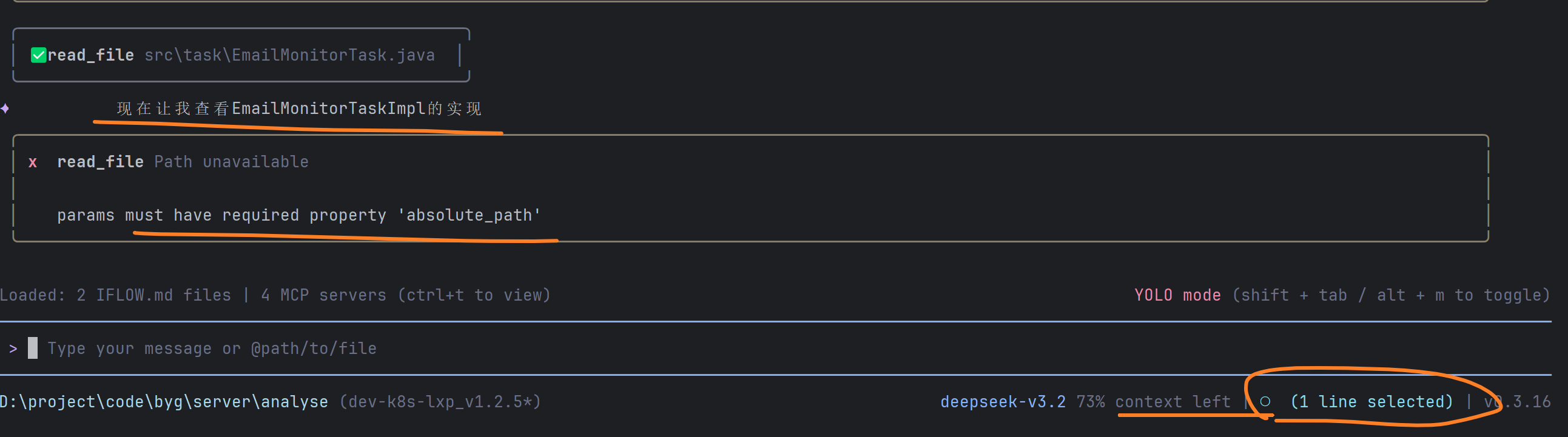 当我选中的代码块,和代码文件之后,工具调用read_file,一直提示路径错误导致模型中断。