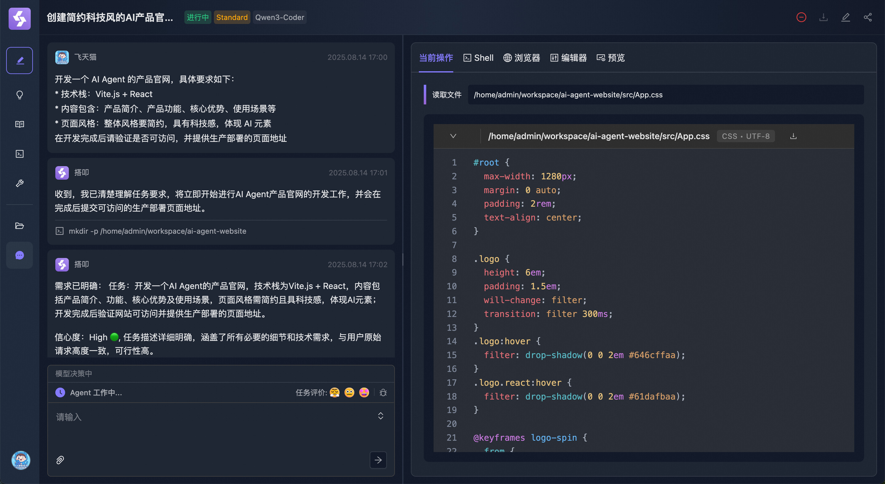 第四步:开始执行任务后,Agent 会立即启动意图识别机制,该机制将精准解析您的核心需求,并理解任务的背景和目标。期间可实时查看搭叩任务的运行过程。