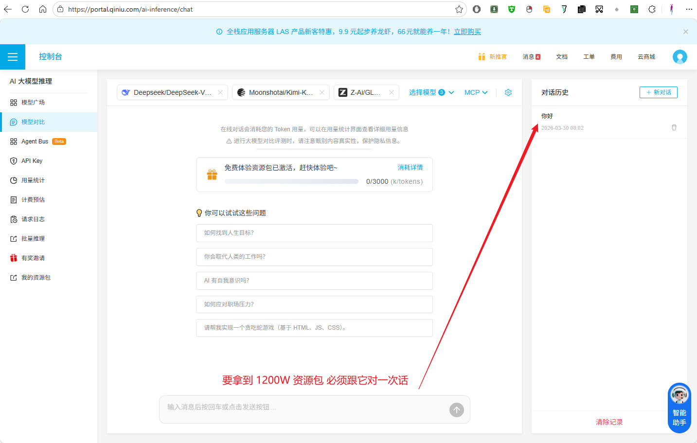 要拿到这1200W 你要实名注册,并且有个坑点,你必须跟 https://portal.qiniu.com/ai-inference/chat 它对一次话。