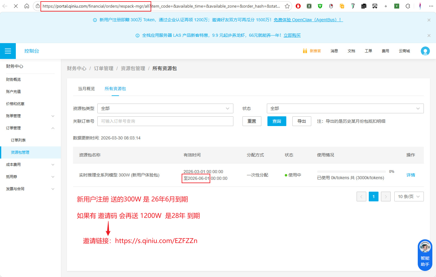 新用户注册 送 300W tokens 资源包,全系列免费用,觉得 300W 太少?用我这个邀请链接: https://s.qiniu.com/EZFZZn 会送 1200W tokens 资源包