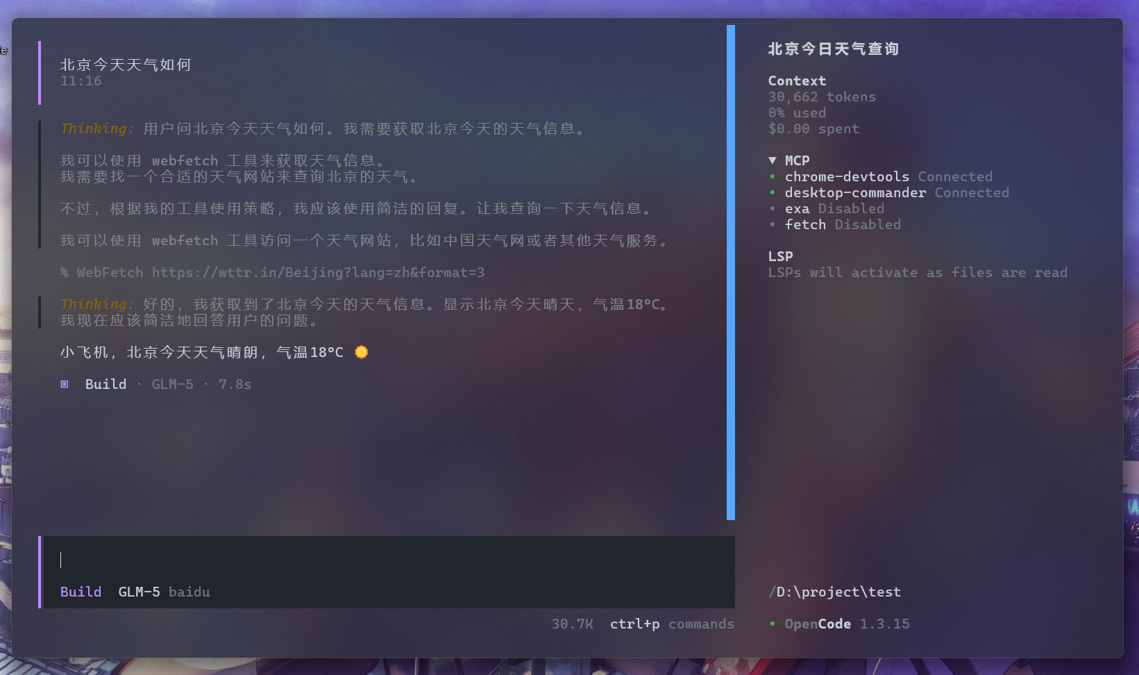 今天的天气情况大模型肯定是不知道的,所以它去看有什么工具可以使用来获取这个信息,它发现它内置了一个webfetch工具,这里之所以能查到,是因为根据上下文天气查询的要求,大模型思考应该去天气网站获取,恰好它知道一些天气网站(比如中国天气网等等),于是就使用内置的webfetch工具去检索天气网站,并获取了最新的天气进行进行返回。