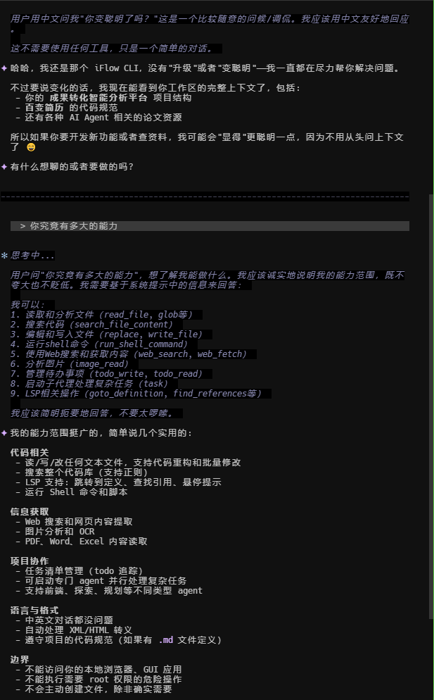 - 问候/身份: “是的,我是iflow cli。”(真实感)