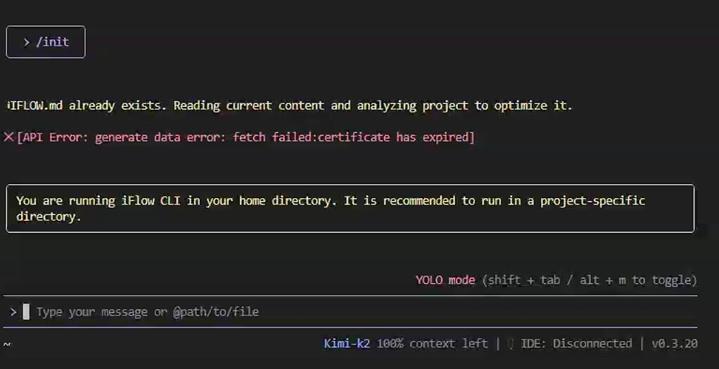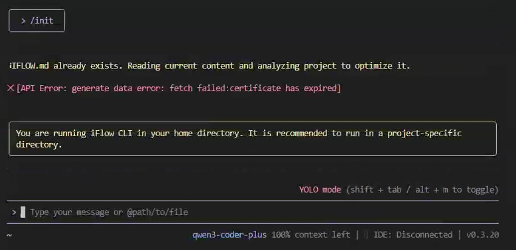 在Windows平台使用的好好的,但是以上到服务器环境的API就突然无法使用了,更换了API查看了 ~/.iflow/settings.json也没有问题,请问各位大佬能不能帮忙看看