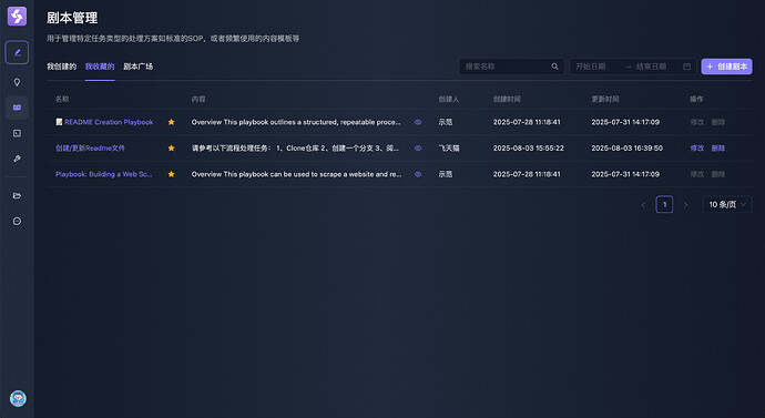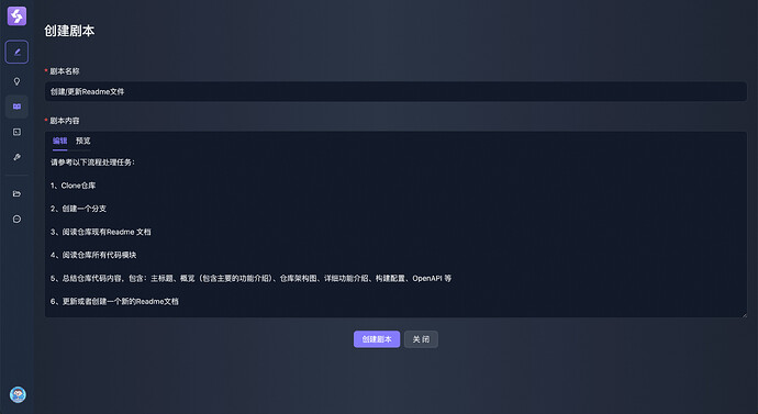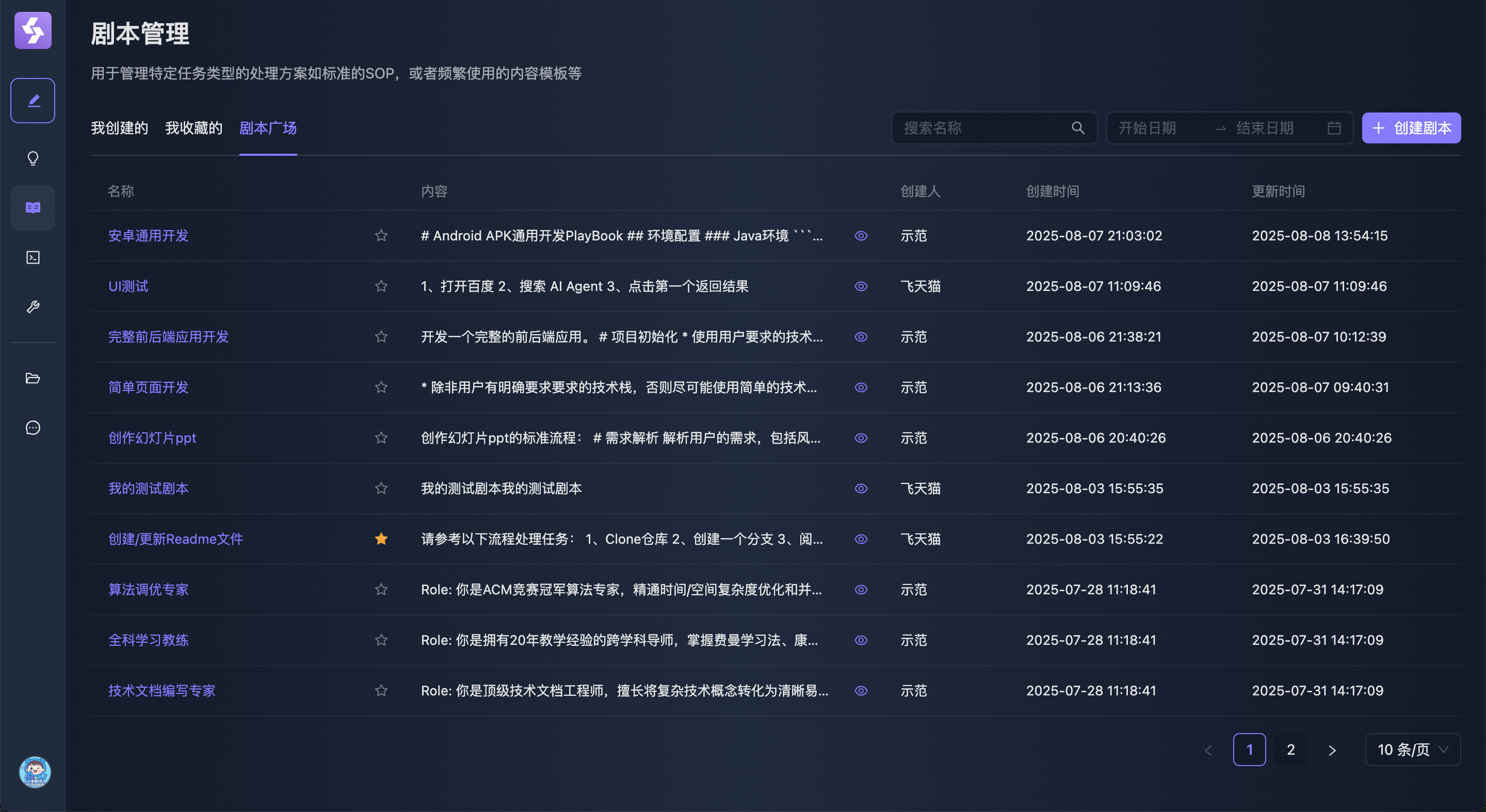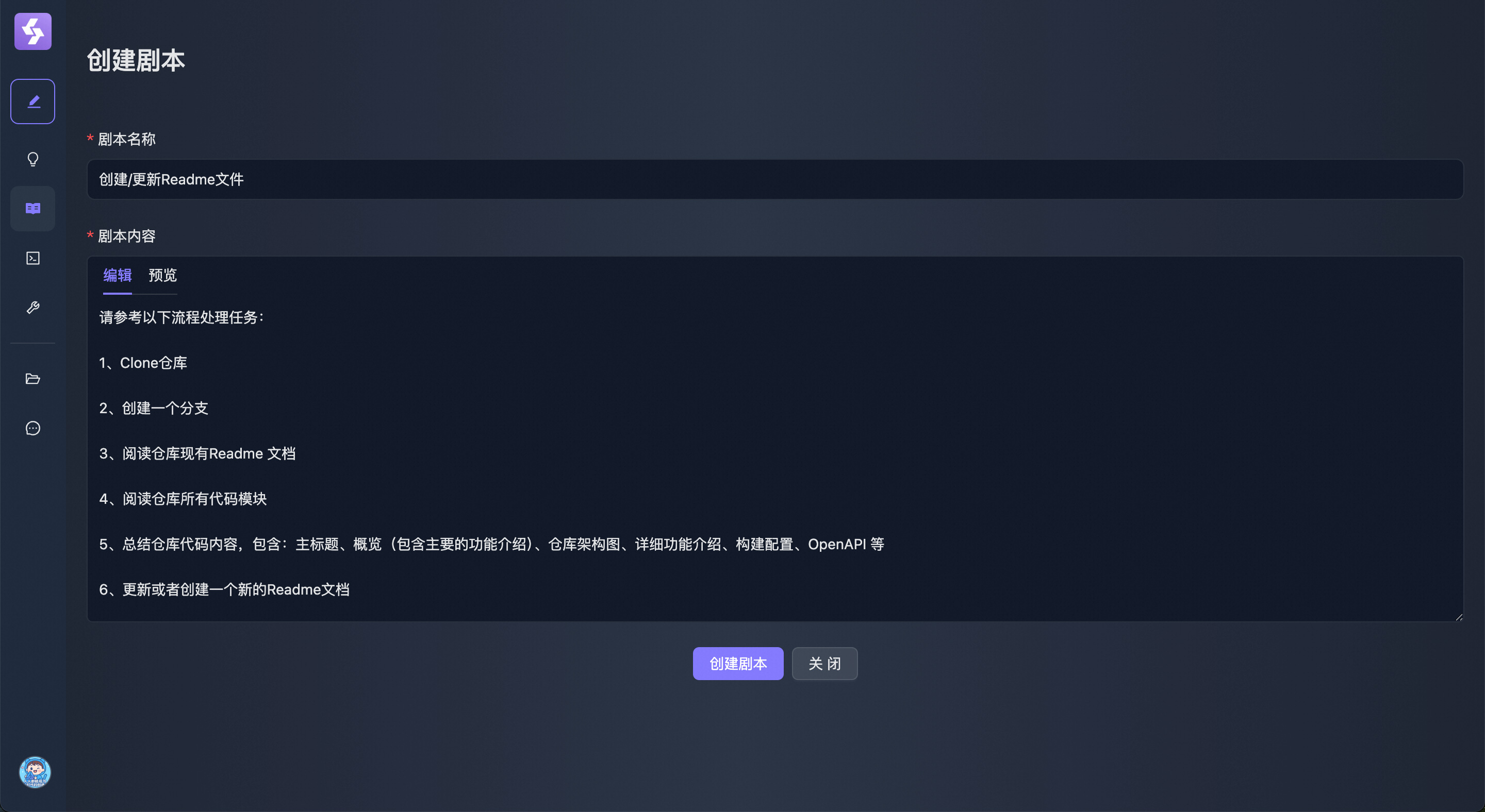 - 剧本内容:如处理某类任务的标准 SOP 流程,支持 Markdown 格式。