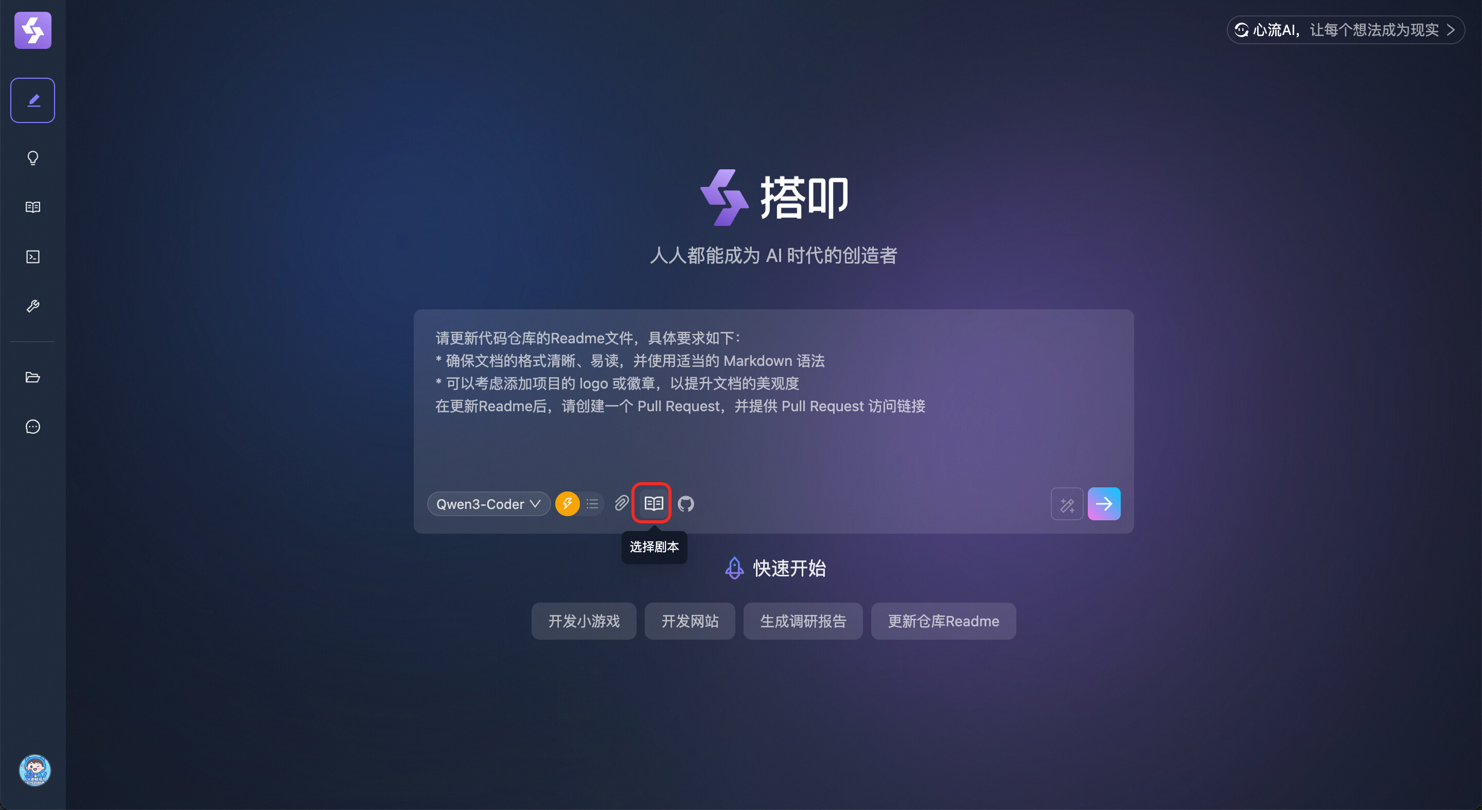 - 在用户发起会话时,可选择某个剧本给到搭叩进行参考。