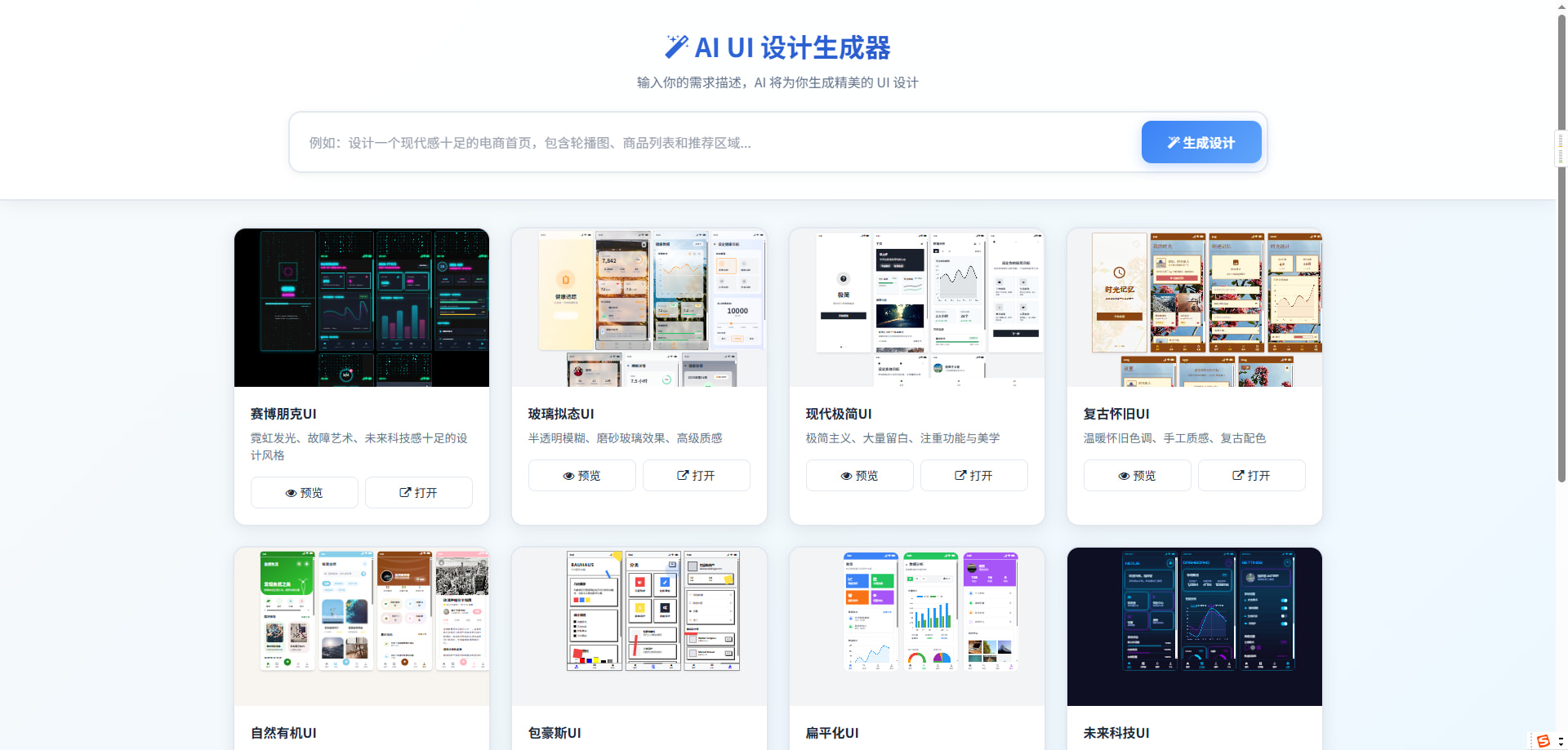 - 智能设计生成:用户输入需求描述,系统提供对应的UI设计建议