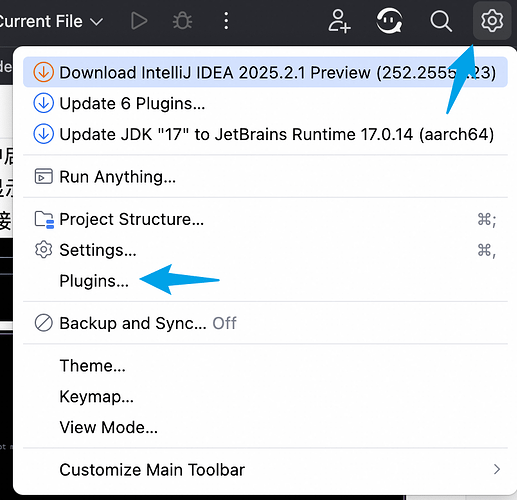 点击 JetBrains IDE 顶部右侧的设置图标,打开插件市场