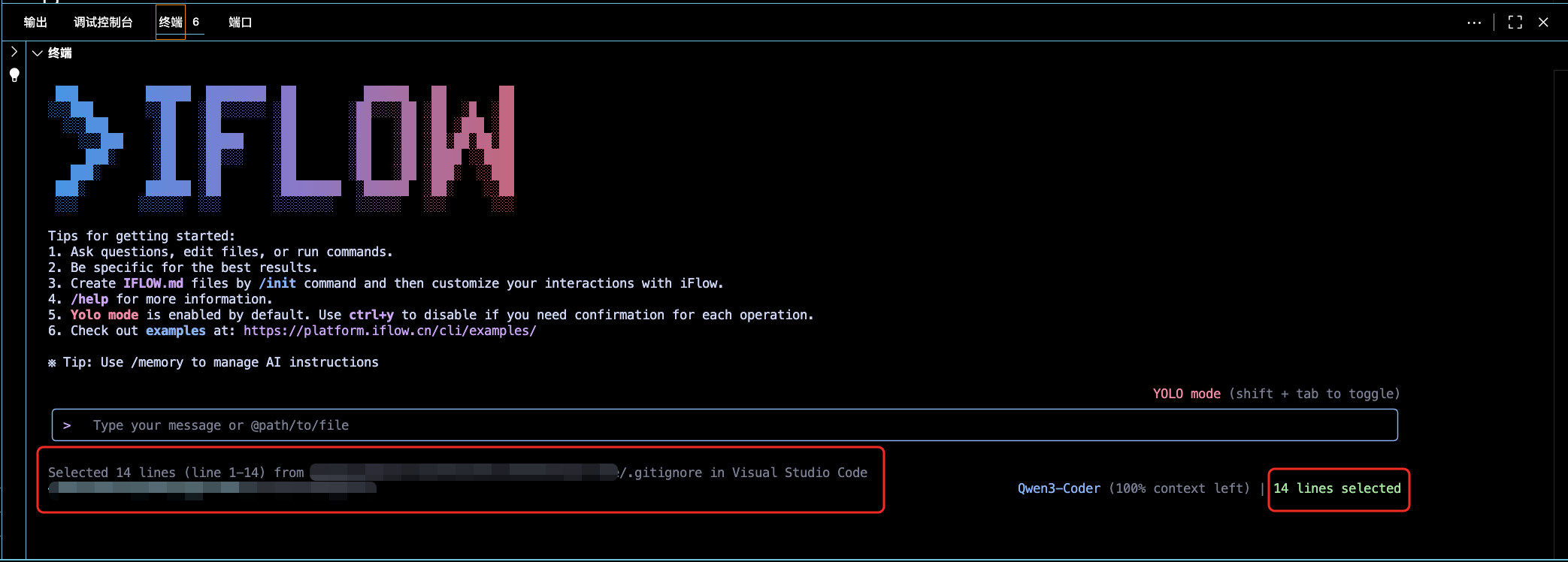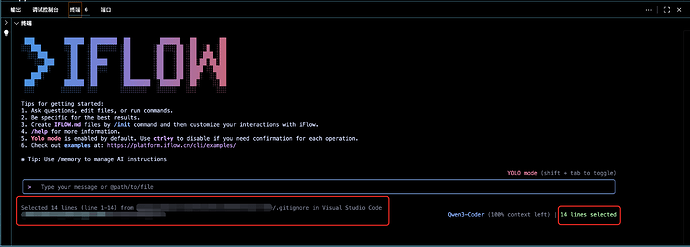 选择上下文: 编辑器中选定的文本将自动添加到 iFlow 的上下文中