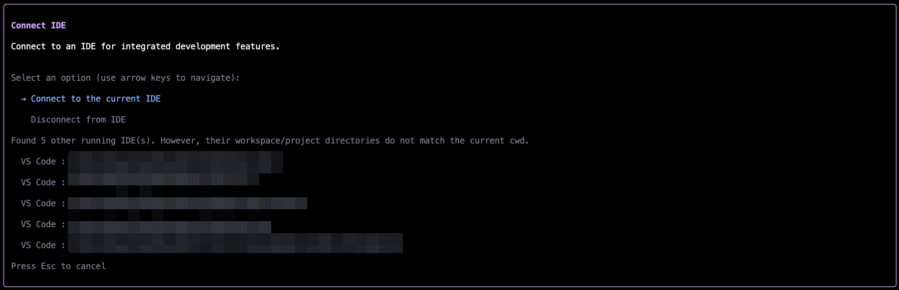 连接感知: 当您在 VSCode 的终端中启动 iFlow 时,iFlow 会自动检测并连接。当连接成功后,iFlow 会在您的终端中显示连接状态"IDE connected"。您也可使用 iFlow 提供的命令"/ide"来手动建立连接
