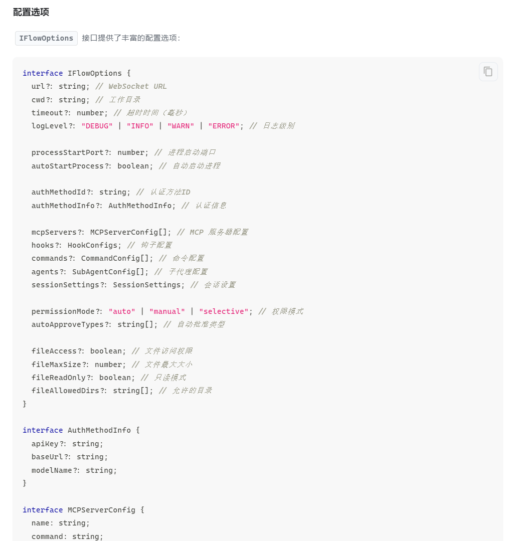 如图,目前已经通过SDK接入了自己的程序,有直接运行iflow cli和sdk两种选择,以为sdk更灵活,后来发现sdk中无法指定模型,官方文档中只有: