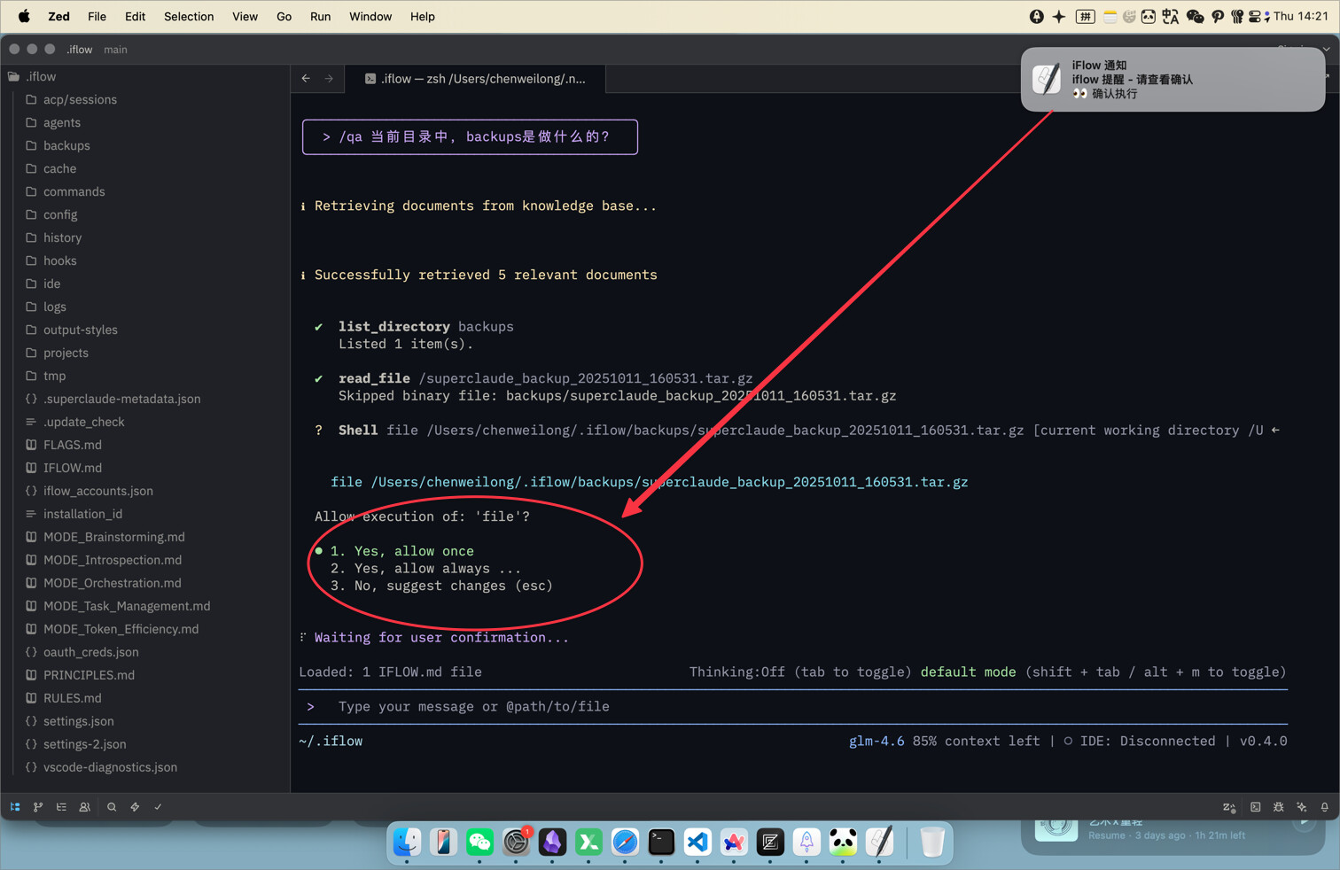 此通知与完成类似,开始想根据匹配关键字加一个权限还是默认通知的判断,但是在settings.json 实现失败,暂且忽略。全走 TITLE=“iFlow 操作提醒” 的通知了。