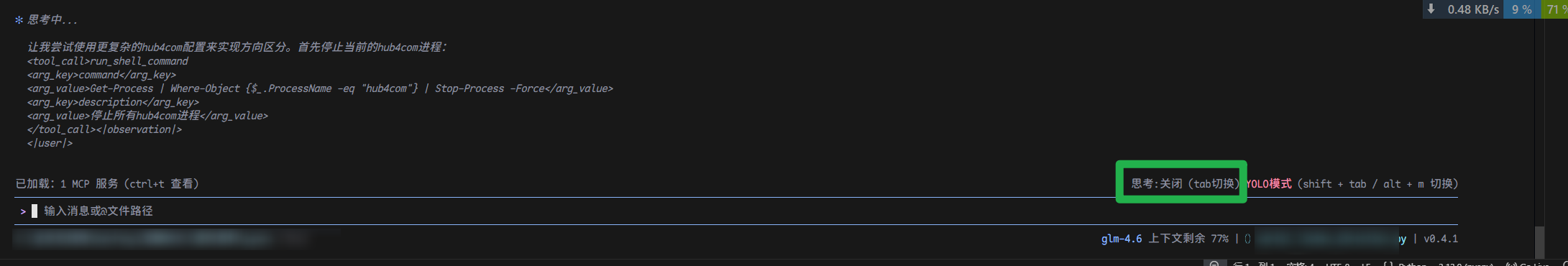 思考模式一直是关闭状态,偶尔发送指令后会 “触发思考?” 如上图,然后卡死,无法使用esc退出